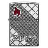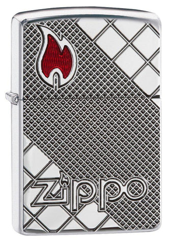 • The Zippo logo is deep carved into this High Polish Chrome Armor lighter. The design also features a bright red epoxy of our iconic flame.