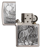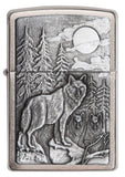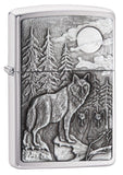 • This Brushed Chrome windproof lighter has an emblem attached displaying a wolf in the wilderness. Comes packaged in a gift box. For optimal performance, fill with Zippo lighter fuel.