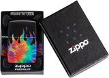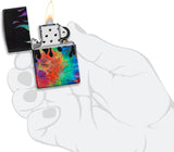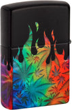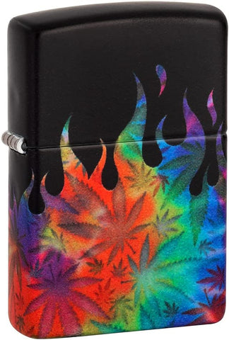 Blazing off this windproof lighter are marijuana leaves engulfed in multi-colored flames. This eye-catching cannabis-inspired piece is created by utilizing Zippo's 540 Color process, which allows for complete coverage of the lighter's surface with precision artwork. Hinges and bottom stamps are laser engraved to allow for peak performance and easy date stamp verification, but otherwise, every single nanometer of the lighter’s surface can be covered by this resilient new process. Comes packaged in a gift box. For optimum performance, fill with Zippo lighter fuel.