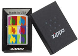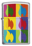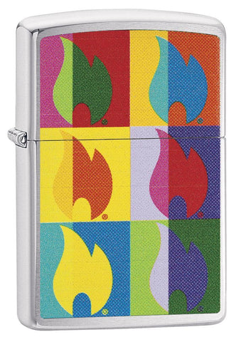 This pop art inspired design remixes the classic Zippo flame to create a more vibrant look. The full surface color imaged art gets placed on a Brushed Chrome model. Comes packaged in a gift box. For optimal performance, fill with Zippo lighter fluid.