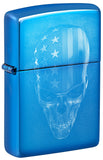 A robotic human skull, adorned with the Stars and Stripes of Old Glory, emerges from the surface of this mesmerizing High Polish Blue lighter in a subtle Photo Image design. Comes packaged in a gift box. For optimal performance, fill with Zippo lighter fuel.