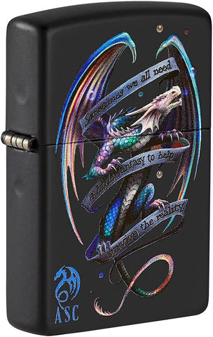 Enter the realm of fantasy with intricate artwork from Anne Stokes! A mighty multi-colored dragon stands firm in between a script that reads "Sometimes we need a little fantasy to help survive the reality." This mythical design is color imaged on a Black Matte lighter. Comes packaged in a gift box. For optimal performance, fill with Zippo lighter fuel.