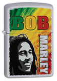 - The smiling face of Bob Marley is featured in black and white in front of a bright background of green, yellow, and red color imaging on a Satin Chrome lighter.