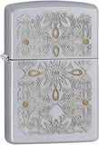 • This satin chrome finish lighter has an ornate pattern engraved into the surface.