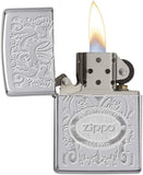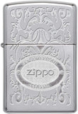This elegant filigree lighter features the Zippo logo stamped on the top of the lid. This design uses the double lustre imprint method on a High Polish Chrome lighter. Comes packaged in a gift box. For optimal performance, fill with Zippo lighter fuel.