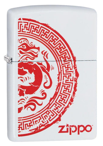 - This White Matte lighter features a Chinese-style dragon design in addition to the iconic Zippo name.