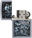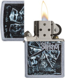 - This Street Chrome windproof lighter is color imaged with a Slipknot design, featuring the logo alongside images of the band members on shards of glass.