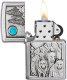 This Brushed Chrome windproof lighter features an attached emblem displaying a fearsome pack of wolves deep in the mountains. Lighting the night sky is a dazzling blue moon emblem. Comes packaged in a gift box. For optimum performance, fill with Zippo lighter fuel.